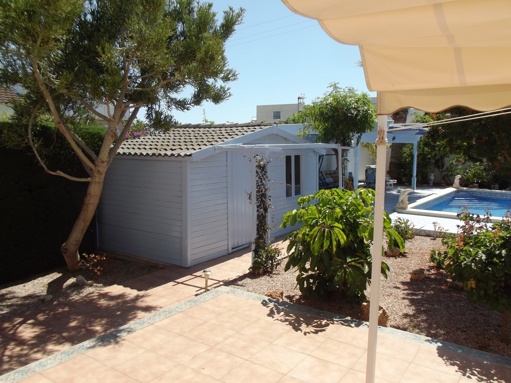 Moving to the outside of the property, there are mature fruit trees and shrubs to the left of the property, along with expansive terraces and additional storage. At the rear, adjacent to the patio doors for the lounge/ diner is a large terrace, with a retractable toldos suitable for al fresco dining. moving further back there is the large 8mtr x 10mtr pool. This is flanked by fruit trees and shrubs, as well as a further shaded area with retractable toldos to one side. At the opposite end there is further storage, along with an outside BBQ.. At the rear of the villa there are stairs (with further storage underneath) to the Solarium that offers views of the salt lake. Moving past the door for the master bedroom further round the villa, you come to the shaded pergola/ car port with side access to the kitchen, and the front driveway area.